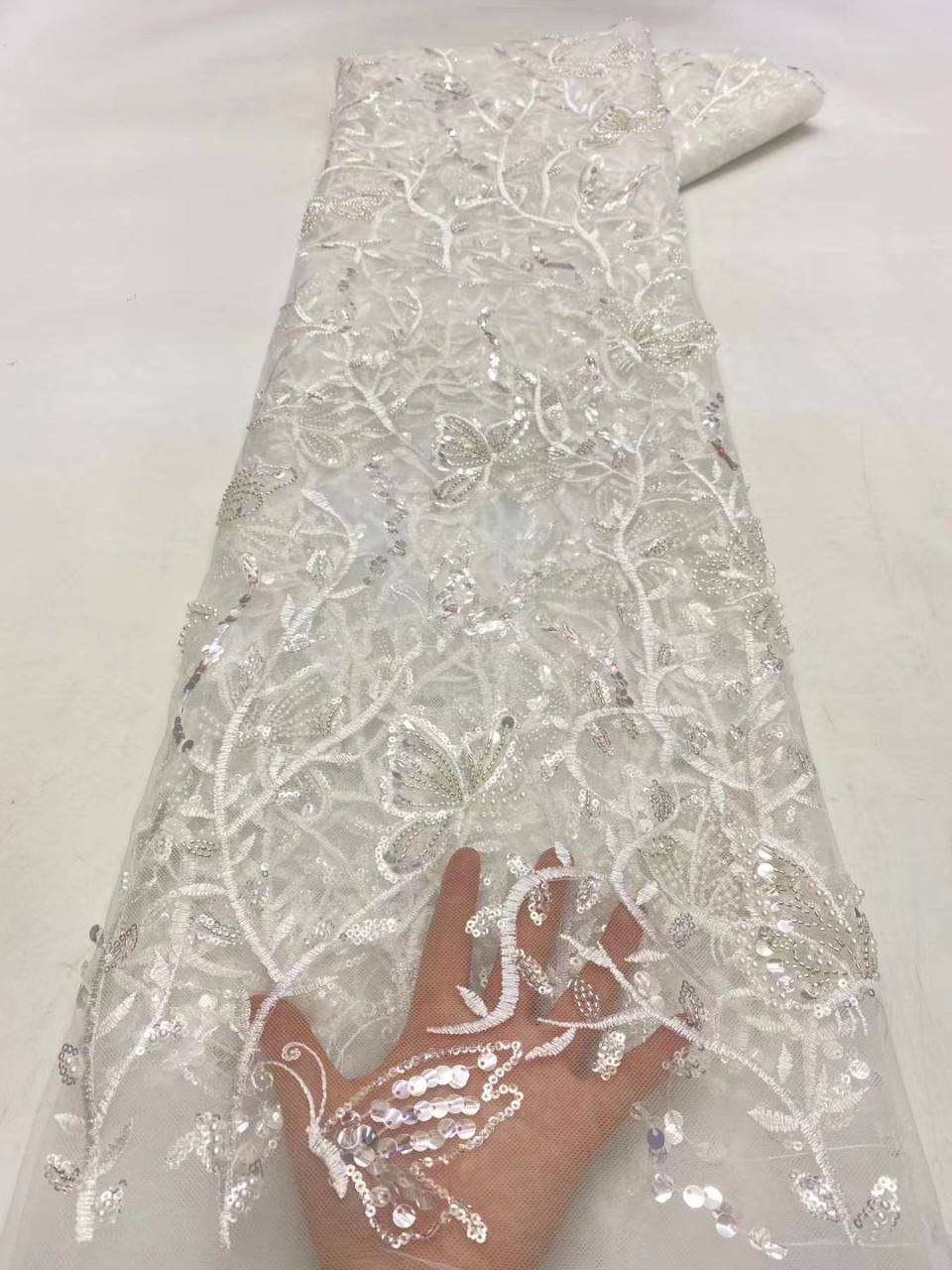 Värviline pulmapitsi kangas 3D liblikate helmestega tikitud hoovidega, millel on kolmemõõtmeline 3D liblikate helmestega tikandidisain, on see luksuslik ja peen, spetsiaalselt kohandatud tipptasemel pulmakleitide ja õhtukleitide jaoks. Iga õue on peeneks tikitud litrite ja helmeste aktsentidega. See on kerge ja hingav, mis sobib pruudi loori, kleidikaunistuste või õhtukleitide valmistamiseks.